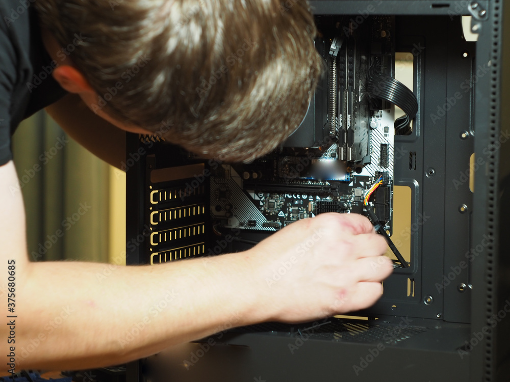 Photography a young man builds a personal computer
