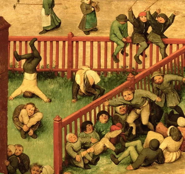 Children's Games (Kinderspiele): detail of left-hand section showing children running the gauntlet, doing gymnastics and balancing on a fence