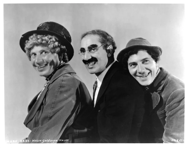 Groucho Marx, Chico Marx and Harpo Marx on set from the film 'A Night At The Opera', 1935. (Photo by Metro-Goldwyn-Mayer/Getty Images)