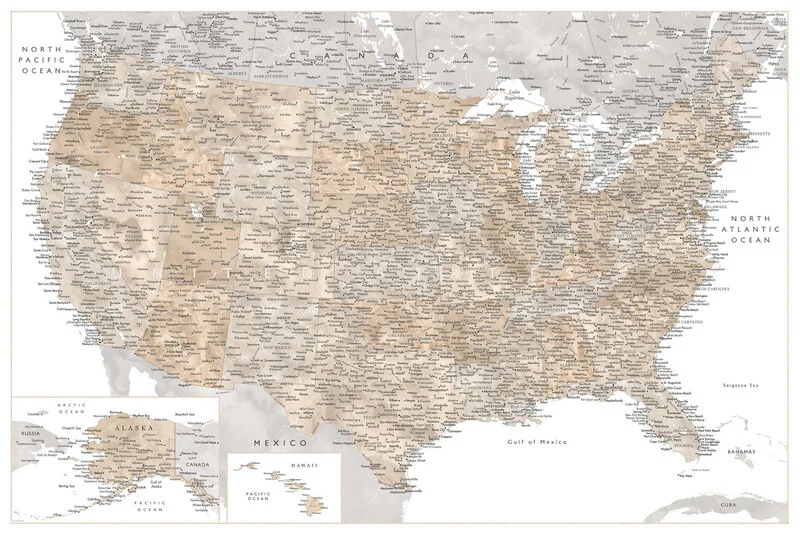 Poster Highly detailed map of the United States in neutral watercolor
