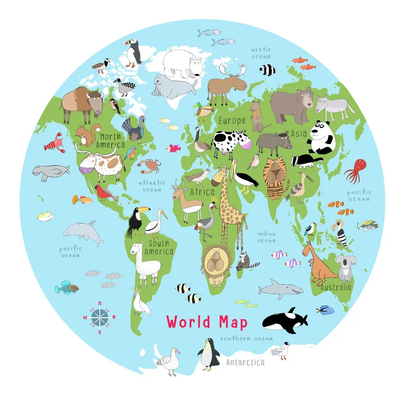 Poster Illustrated World Map Animals and Fish Light Blue