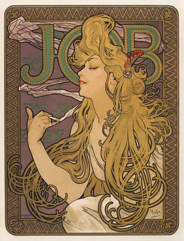 Advertising for the brand of papers a cigarette “” Job””, Lithography by Alphonse Mucha , illustrateur tchecoslovaque, 1897, Bibliotheque des Arts Decoratifs, Paris - Poster advertising the cigarette paper “” Job”, Lithography by Alphonse Mucha , 1897, Li
