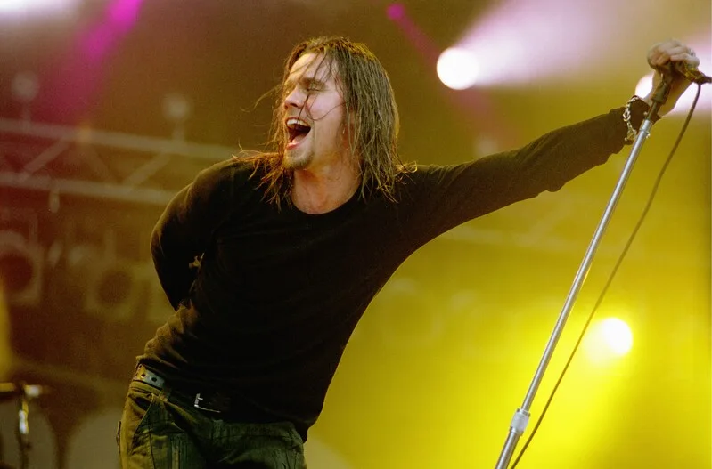NETHERLANDS - JUNE 04: PINKPOP FESTIVAL Photo of ALTER BRIDGE, Alter Bridge, Pinkpop, Landgraaf, Nederland, 04 juni 2006, Pop, grunge, rock, de zanger met zijn lange natte haren schreeuwt het uit en houdt met zijn rechterhand de microfoonstandaard vast, op de achtergrond zie je mooie rode bruine en gele lichtbundels (Photo by Peter Pakvis/Redferns)