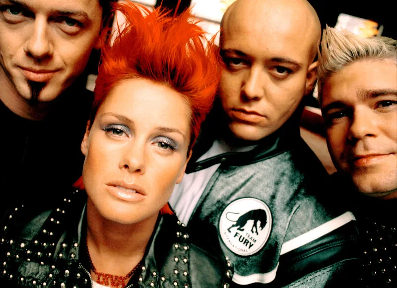 NETHERLANDS - circa 2000: Danish pop band Aqua posed together in The Netherlands circa 2000. Left to right: Claus Norreen, Lene Nystrom, Rene Dif and Soren Rasted. (Photo by Michel Linssen/Redferns)