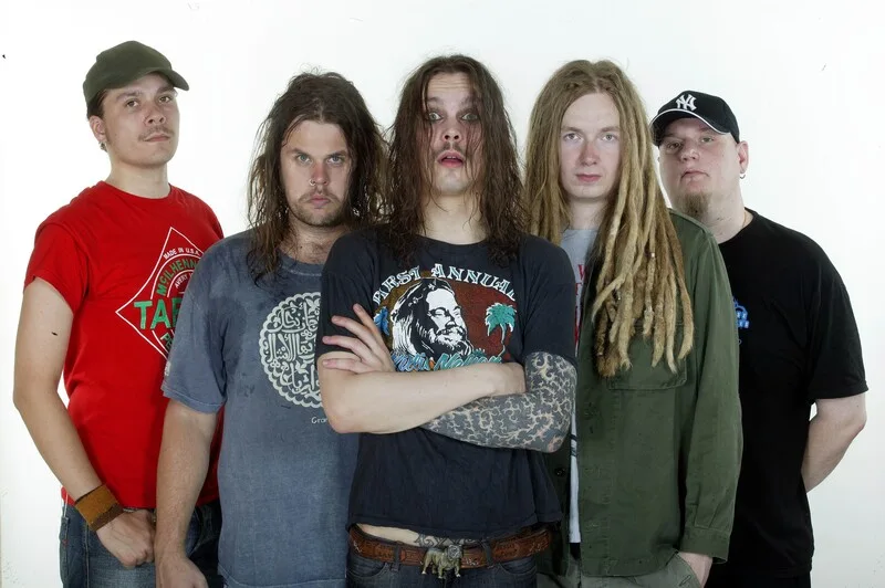 UNSPECIFIED - JANUARY 01: Photo of HIS INFERNAL MAJESTY and HIM and Ville VALO and Janne PUURTINEN and Mikko PAANANEN and Mikko LINDSTROM and Mika KARPPINEN; Posed studio group portrait L-R Janne Puurtinen, Mikko Paananen, Ville Valo, Mikko Lindstrom and Mika Karppinen (Photo by Mick Hutson/Redferns)