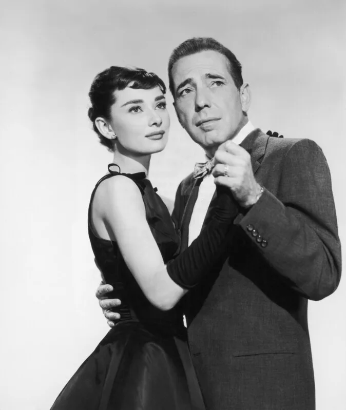 1954: American actor Humphrey Bogart (1899 - 1957) and Belgian-born actor Audrey Hepburn (1929 - 1993 dance together in a promotional portrait from director Billy Wilder's film, 'Sabrina'. Hepburn wears a black gown and long black gloves. (Photo by Hulton Archive/Getty Images)