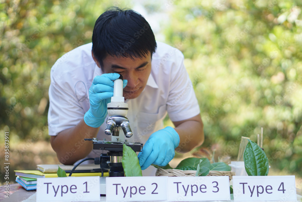 Photography Asian man is doing science experiment by using microscope, inspect and analysis
