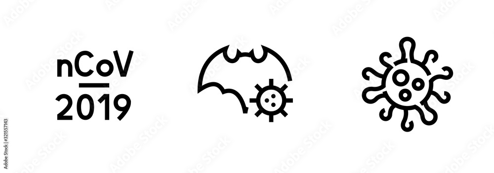 Photography Bat virus causative agent 2019-nCoV. Editable line vector set