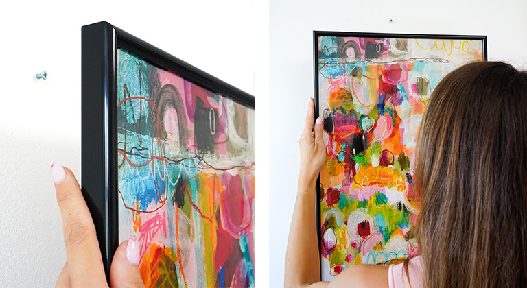If you only want to hang small and light pictures or are you wondering how to do it “so I don’t destroy the wall”, our easy-on/easy-off” hooks will be the right choice for you. Anyone can really hammer them into the wall, you can change the wall arts on them as you like. And when you want to move the picture, you can easily remove the hook from the wall and just put it elsewhere. This option represents the most gentle way of mounting the image without drilling.