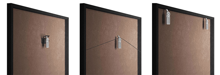 The hooks can be attached directly to the frame, with a bracket, or with a wire. All methods are simple, fast, and secure. Since no drilling is required, your walls are protected and the installation is clean and easy.