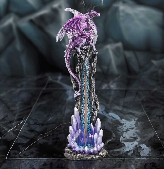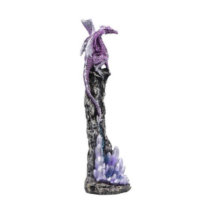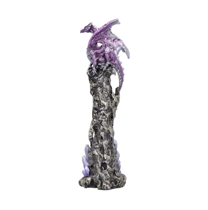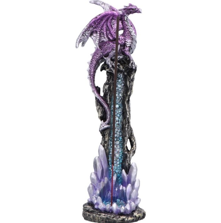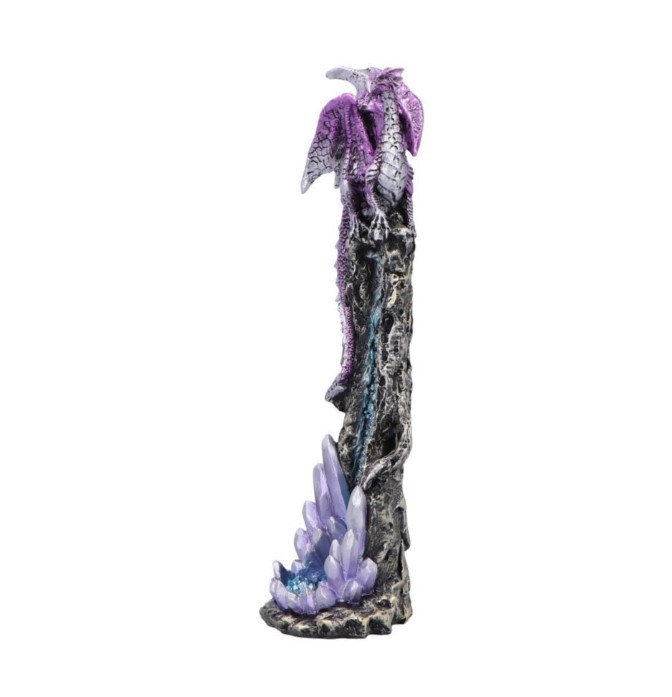 The Mythic Crystal Incense Holder is a stunning resin figurine designed for both functional and decorative purposes. This enchanting piece features a beautifully crafted crystal structure, topped with a shimmering purple dragon, creating a captivating focal point for any space. The light blue and purple hues give the piece a mystical, shimmering appearance, making it a perfect addition to gift shops and stores catering to fans of dragons, fantasy, and incense holders.