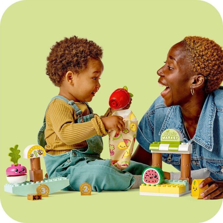 Play shop with the kids with the LEGO® DUPLO® My First Organic Farmers Market (10983) building set. This cute farmers market lets kids play in the real world. They will weigh the food, pay with coins of different denominations and carry the food home in an adorable cloth bag.