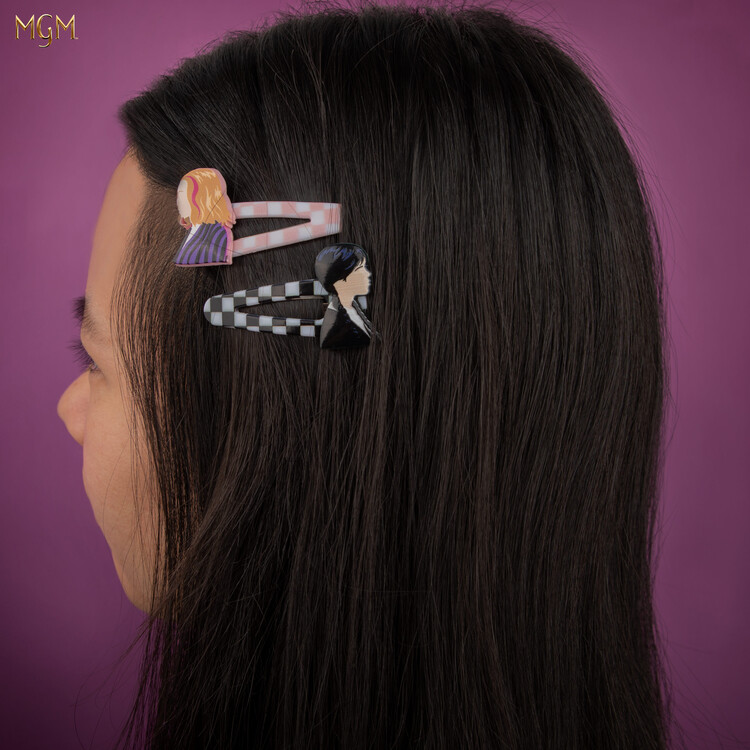 Set of 4 hair clips inspired by the series Wednesday: two bow clips and two snap clips featuring. A stylish accessory that pairs Wednesday’s dark elegance with Enid’s pastel energy. Dimensions: bow clip 10 × 5 × 2.5 cm; snap clip 6 × 3 × 0.7 cm.