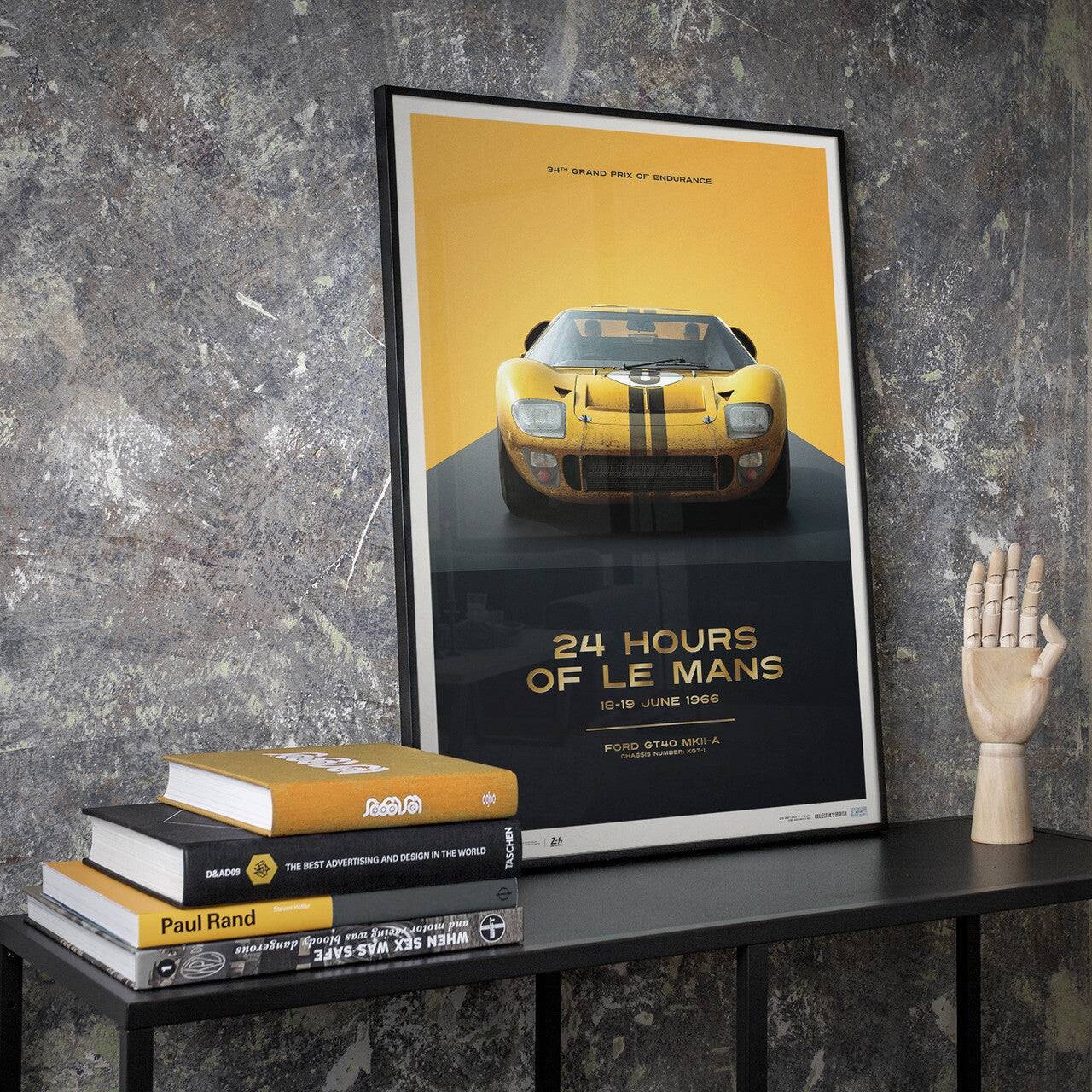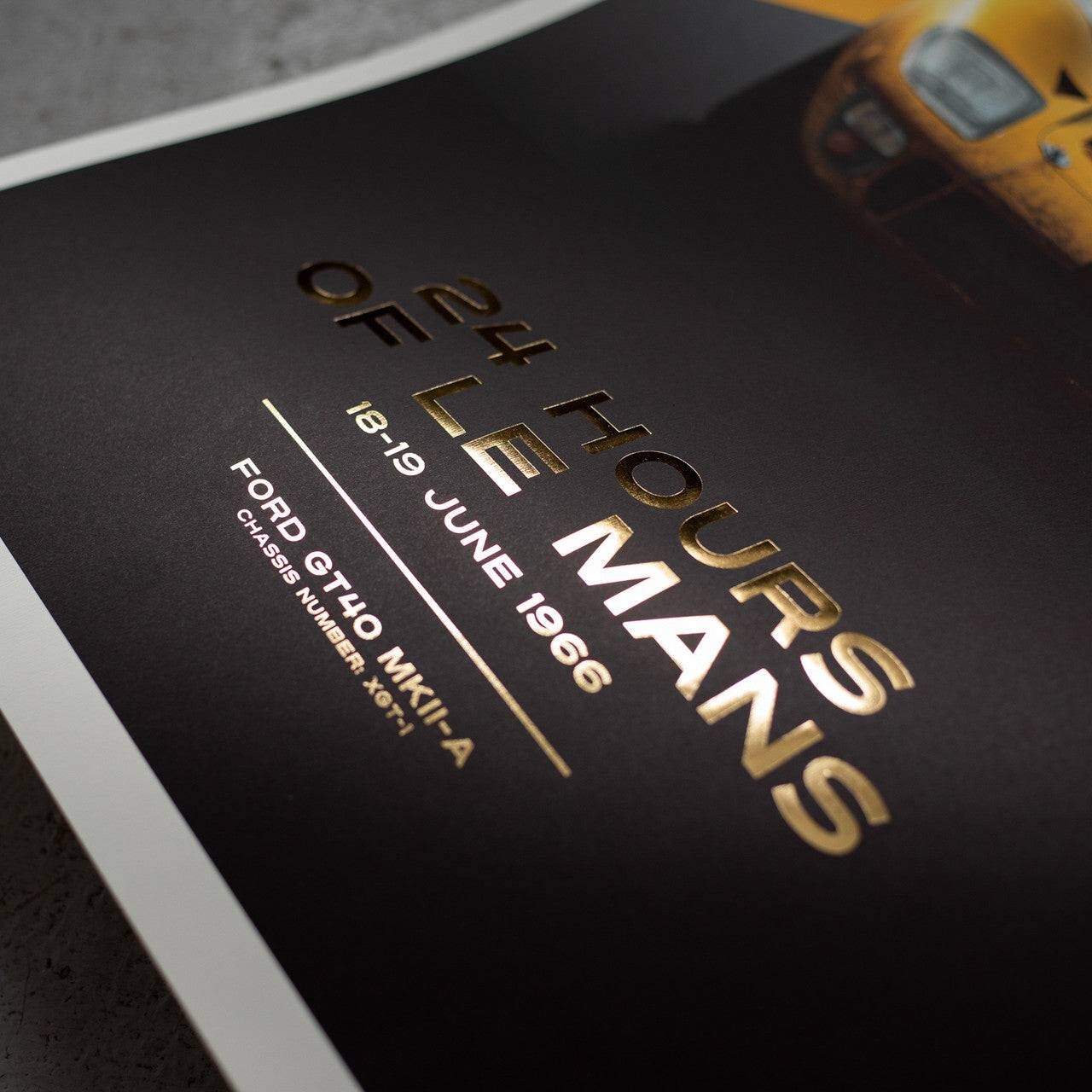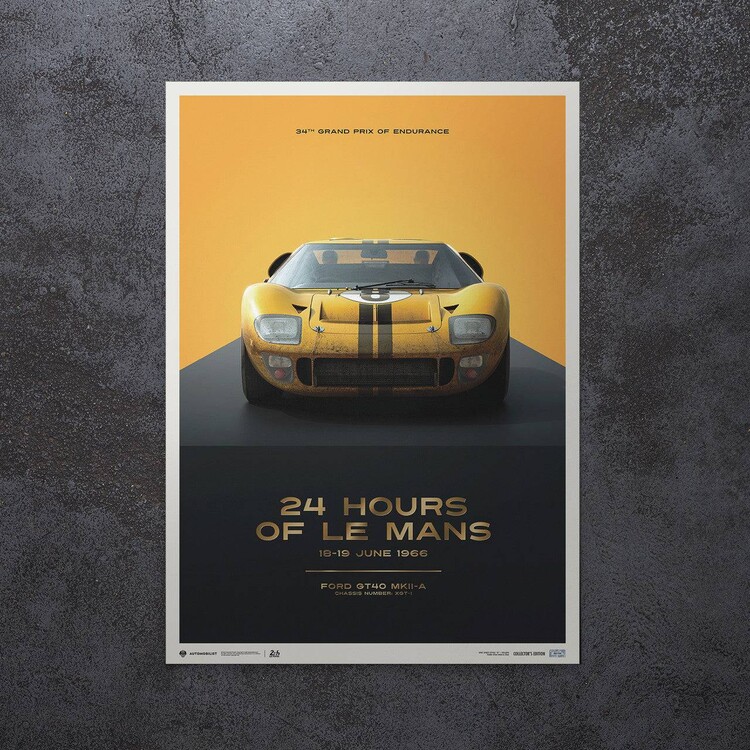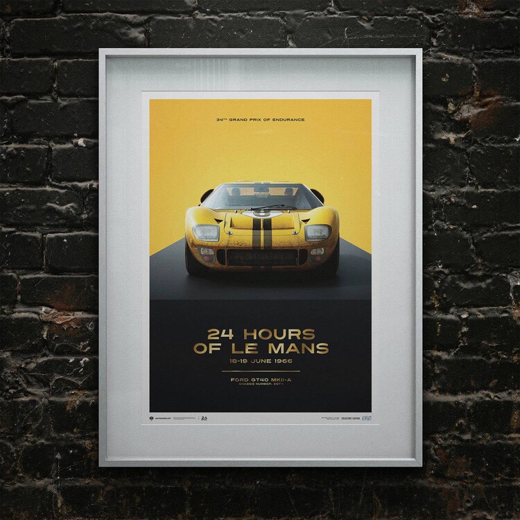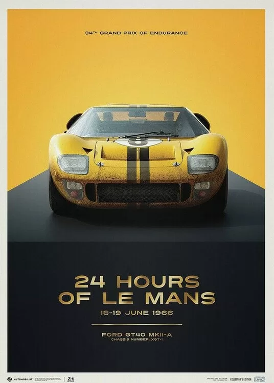 This poster features the yellow-colored Alan Mann Racing Ltd. GT40 driven by Sir John Whitmore and Frank Gardner in ‘66.