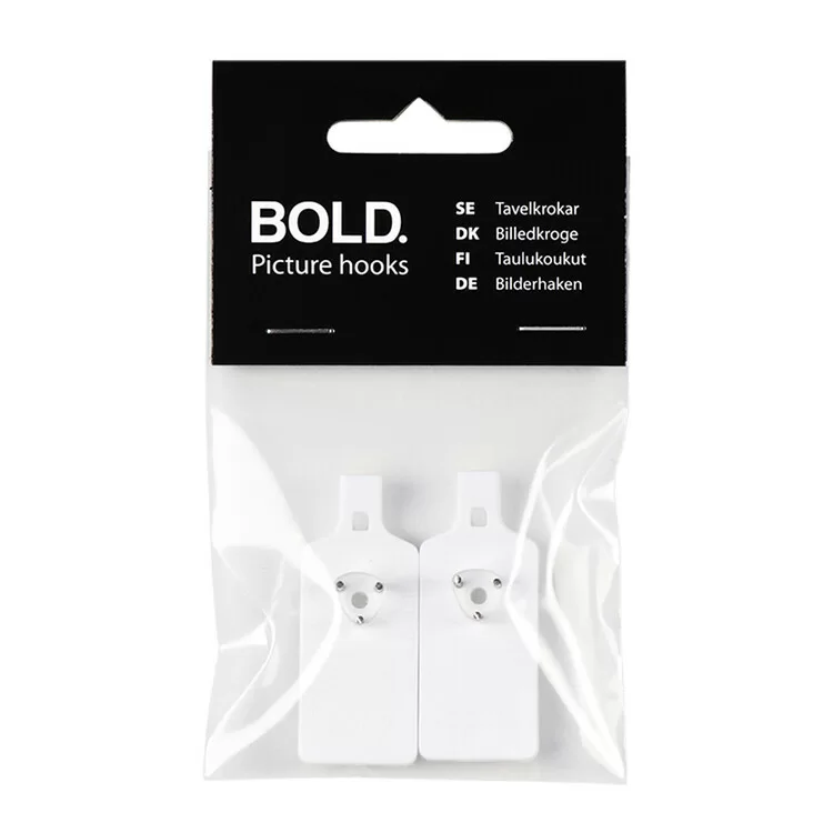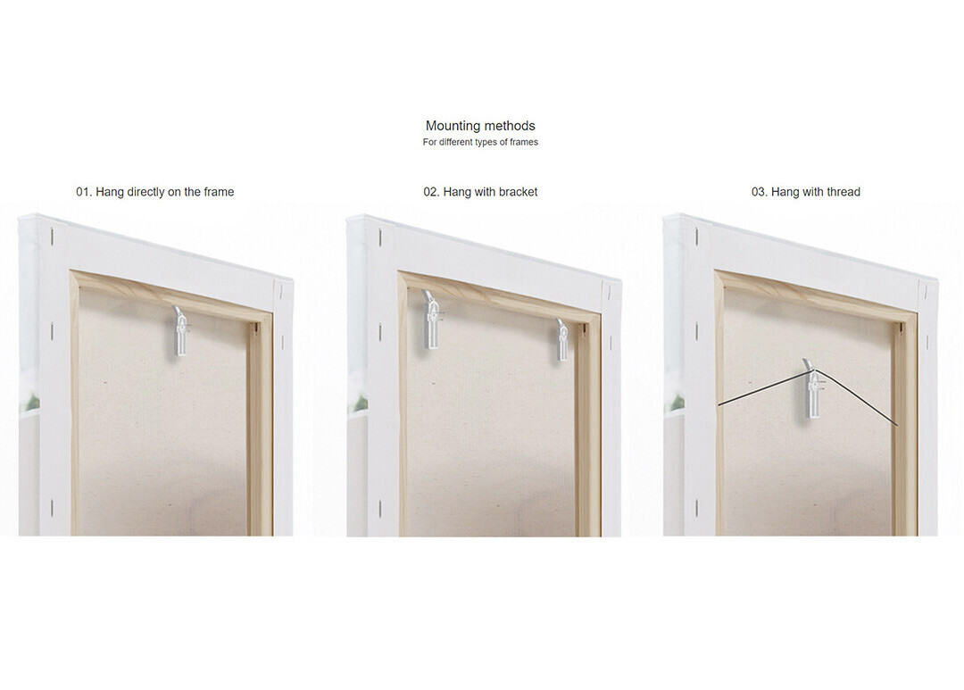 The package contains 2 plastic hooks measuring 5.5 cm x 2.5 cm, which you can use to easily attach the picture to the wall. Quick and easy, without the need for screws, dowels or drilling!