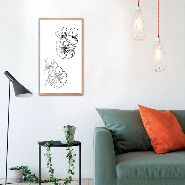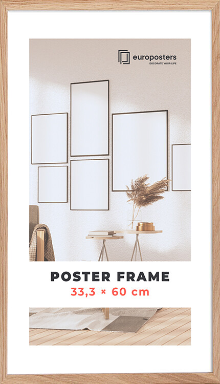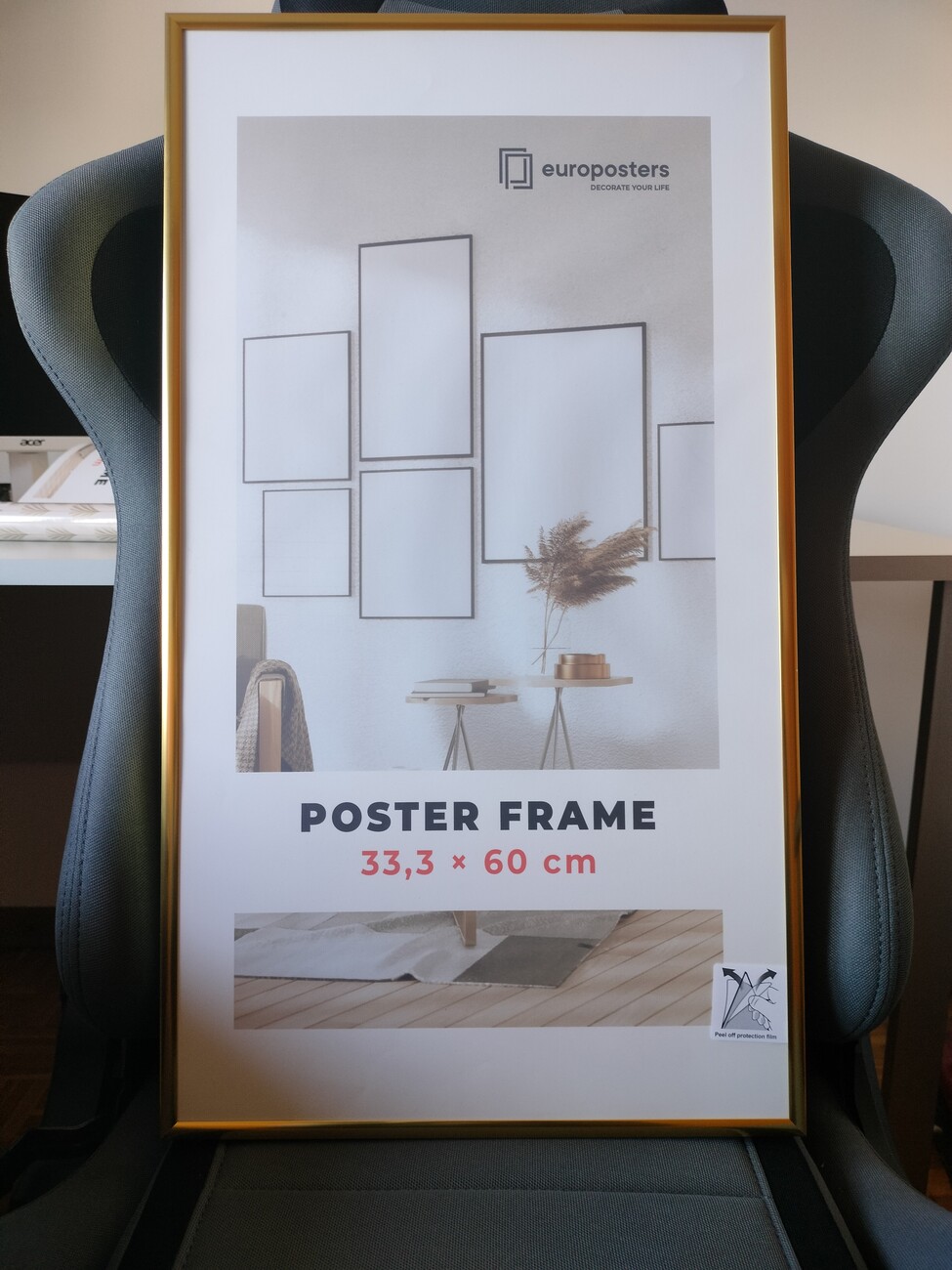 High quality European made poster frame with plexiglass and MDF board. On the back it contains steel handles on both sides for easy hanging. Does not contain a passepartout.
