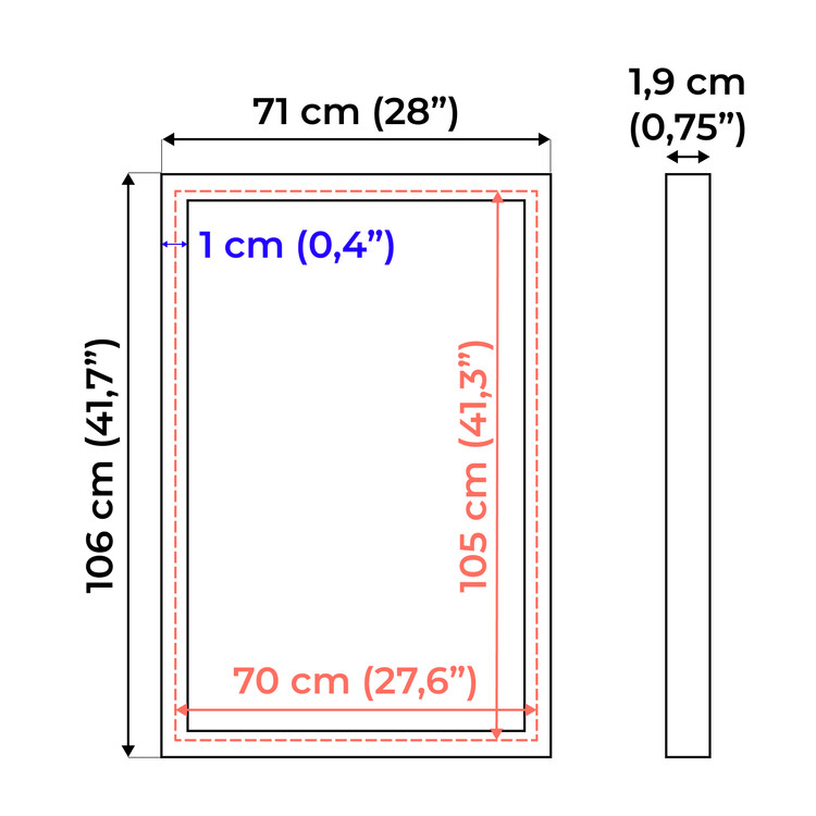 High quality European made poster frame with plexiglass and MDF board. On the back it contains steel handles on both sides for easy hanging. Does not contain a passepartout.