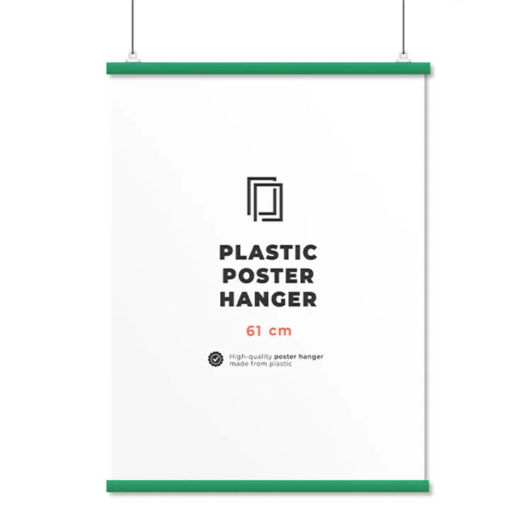The poster rails pack contains 2 pieces of plastic rails + 2 sliders to hang them on nails or stretch a string between them.