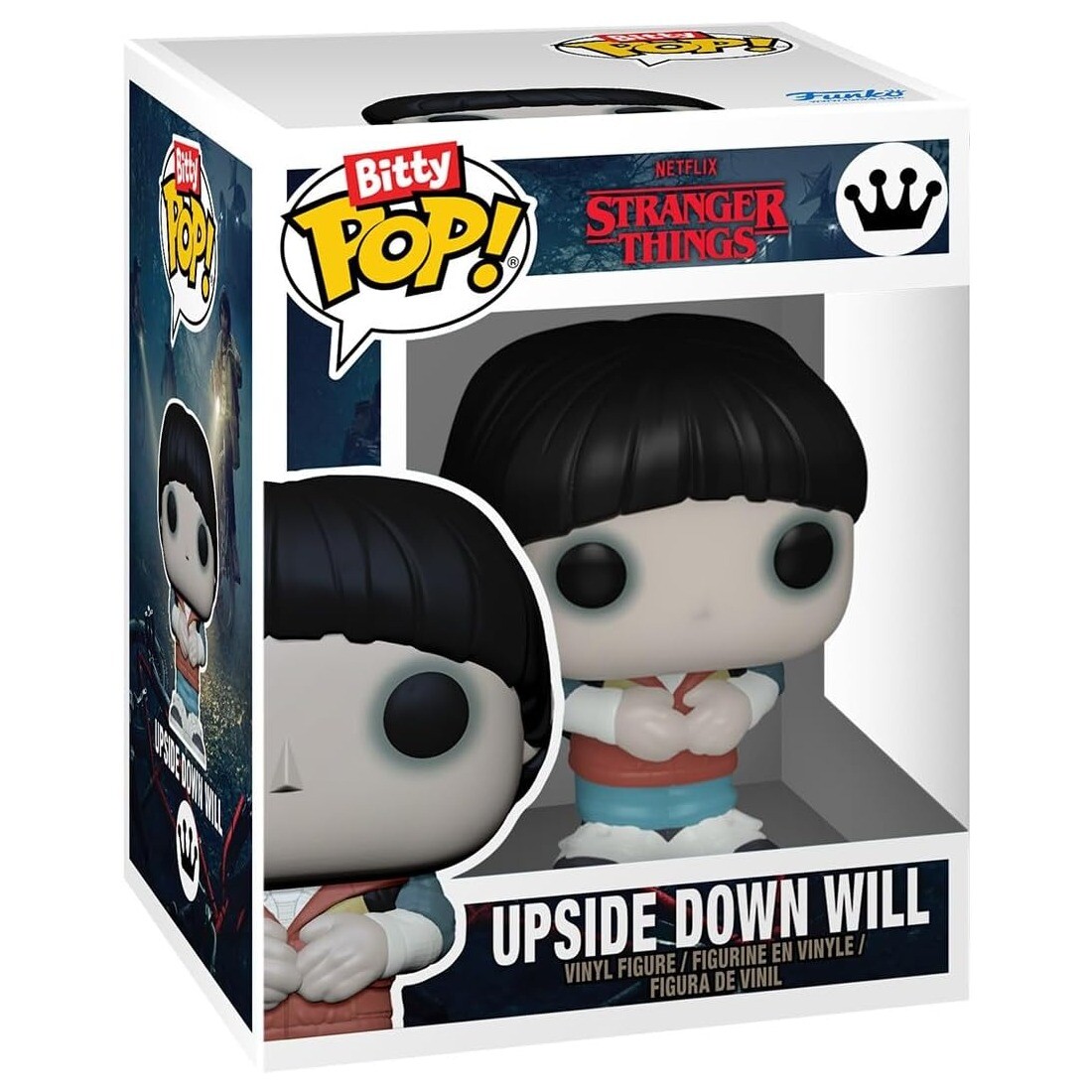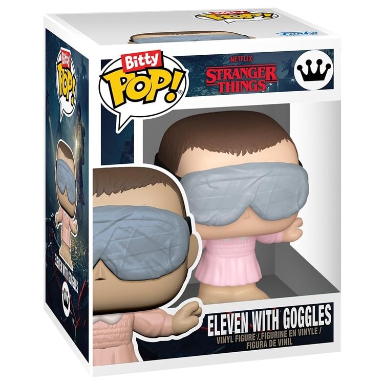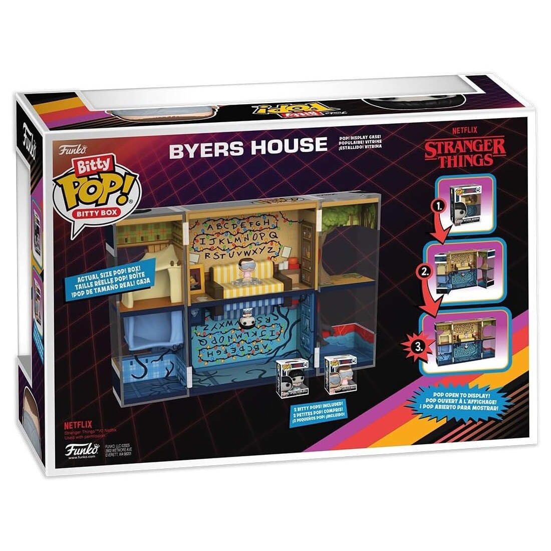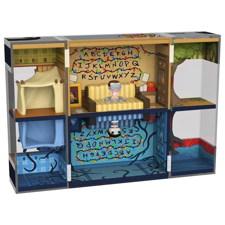 Bitty POP! Byers House: a sturdy acrylic case opens to reveal rooms of the Byers house (approx. 15.8 × 11.9 × 8.8 cm); inside are mini figures Will and Eleven, each about 2.3 cm tall.