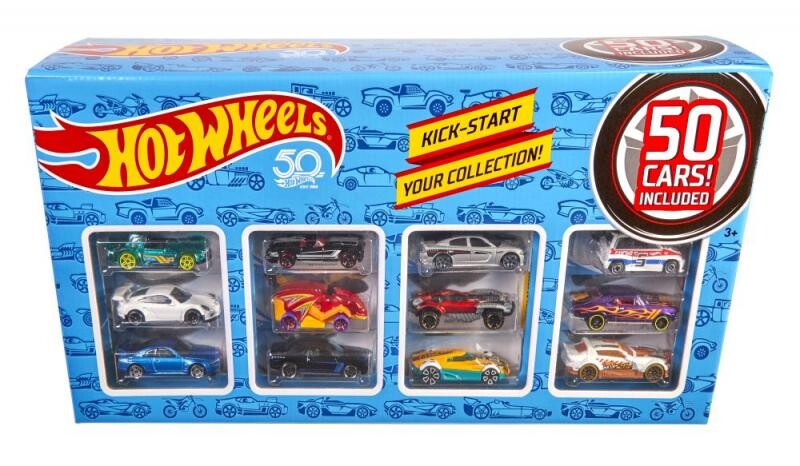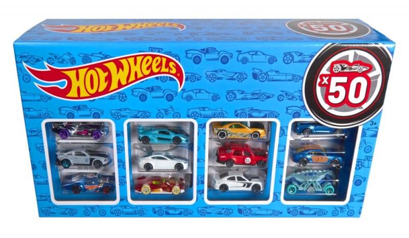 Hot Wheels® Basic Collection — 50 individually boxed 1:64 cars in a branded case; perfect for rewards, party bags and quick gifts. Assortment and deco vary; specific models cannot be chosen. Price shown is for the full set of 50.