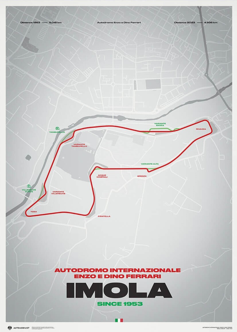 Presenting the newest addition to our beloved Racing Circuits collection: The Imola Circuit Poster, just in time for the 2024 Grand Prix. Available in the timeless unlimited white version, this poster showcases the current track layout in bold red, while paying homage to the historic corners of yesteryears in green, complete with their original names.