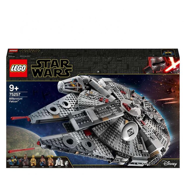 Inspire kids and adults with this 75257 LEGO® Star Wars™ Millennium Falcon. This brick version of the iconic Corellian freighter includes a variety of details such as a rotating upper and lower gun turret, 2 spring-loaded ejectors, a launch pad and an opening cockpit with room for 2 minifigures. The top panels can be opened to view the elaborate interior, where kids will love reenacting scenes from Star Wars: Rise of Skywalker with Star Wars characters such as Finn, Chewbacca, Lando Calrissian, Boolio, C-3PO, R2-D2 and D-O. This iconic LEGO Star Wars set also makes a great collectible gift for any fan.
