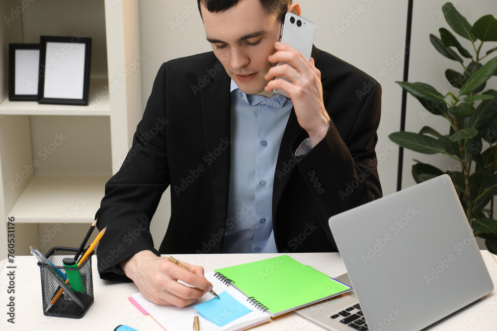 Photography Man taking notes while talking on smartphone at table in office