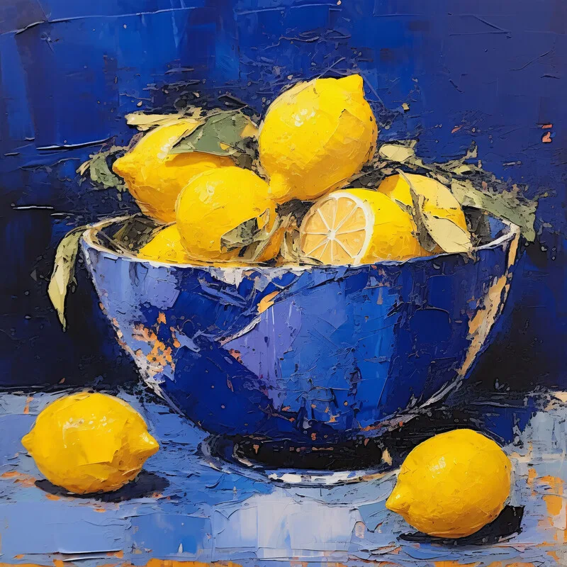 Canvas Print A blue ceramic vase with lemon in the kitchen; wall decor