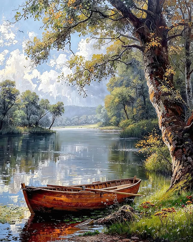 Canvas Print A Boat Anchored at the River's Edge in a Forest, wall decor
