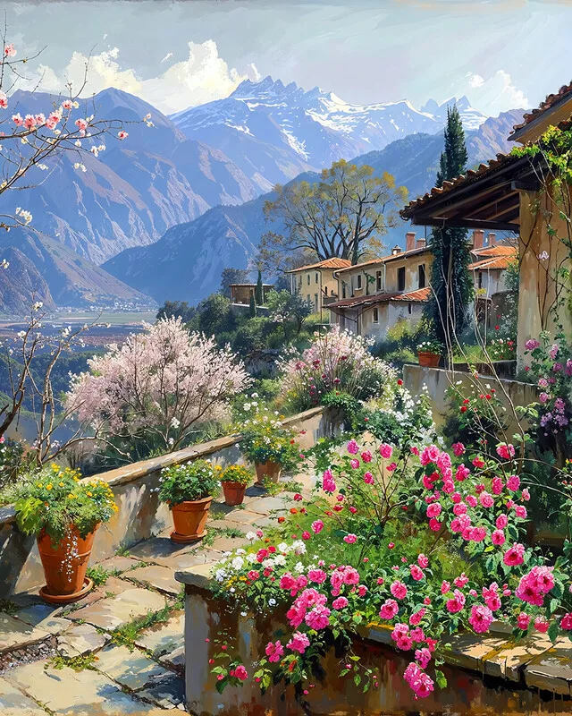 Sticker A Picturesque Village Blooming Flowers in a Mountain