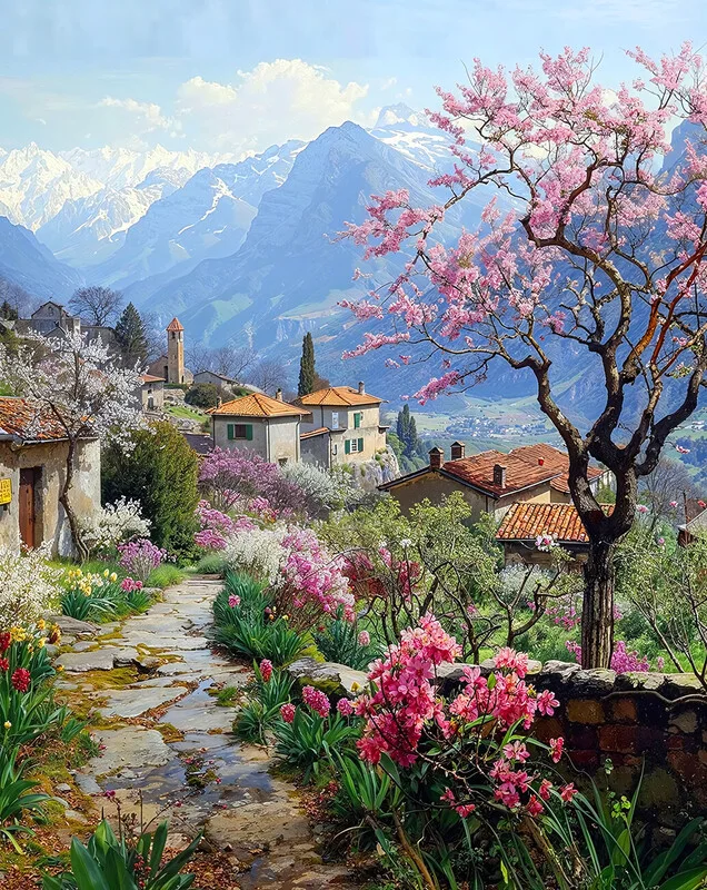 Sticker A Picturesque Village Surrounded by Blooming Flowers