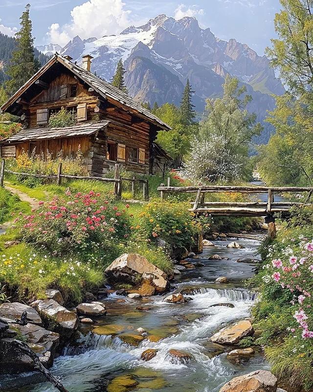 Canvas Print A stream of water near a house & a wooden bridge, wall decor