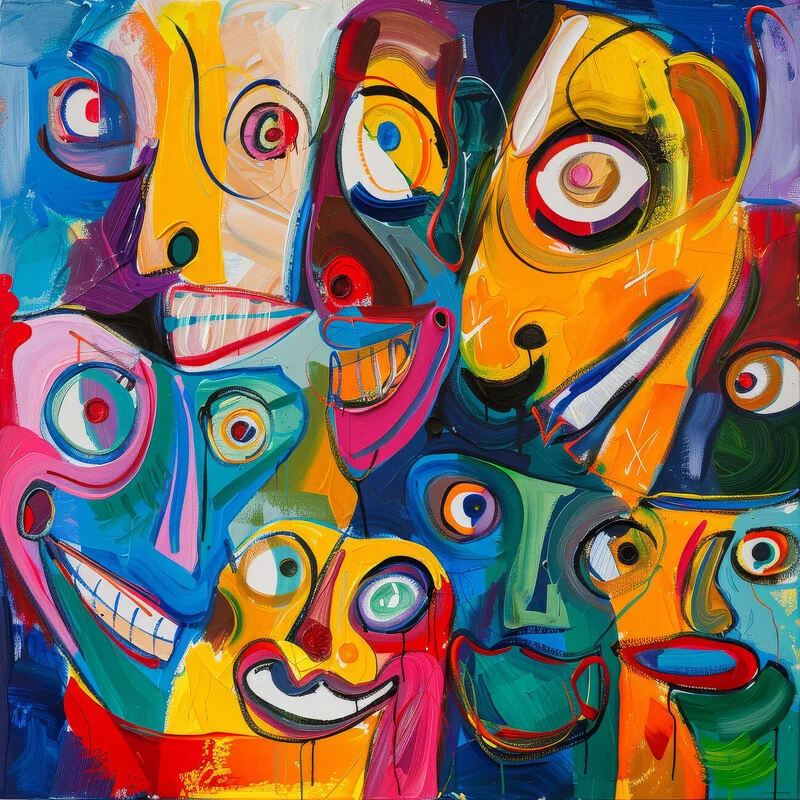Sticker Abstract Portrait Art, Happy Smiles in a Surreal Faces