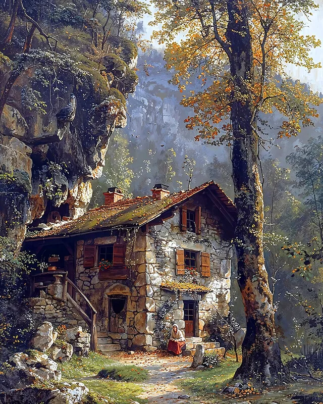 Canvas Print An Old Country House Nestled in the Forest at the Mountain