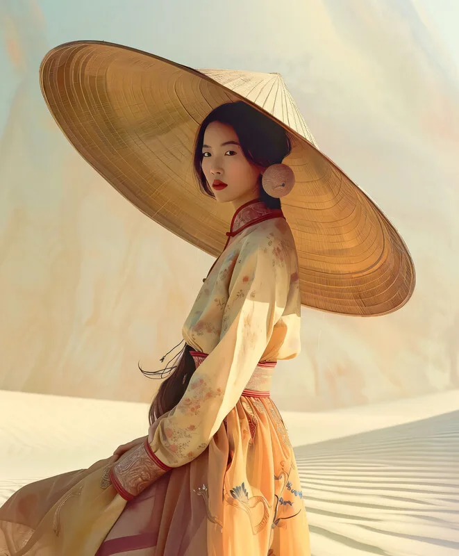 Sticker Asian woman in a yellow kimono on a desert, Chinese figures