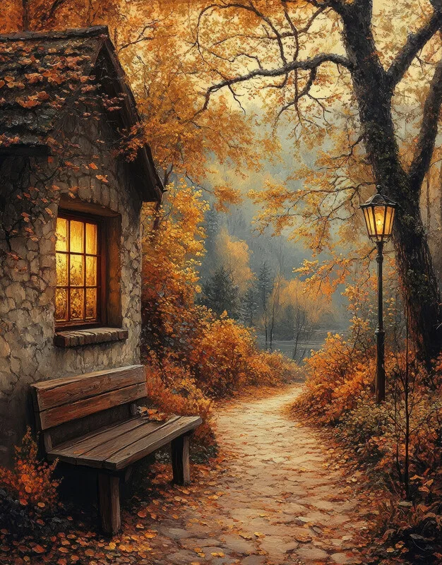 Poster Autumn Cottage Landscape, Fall Foliage Wall Art decor