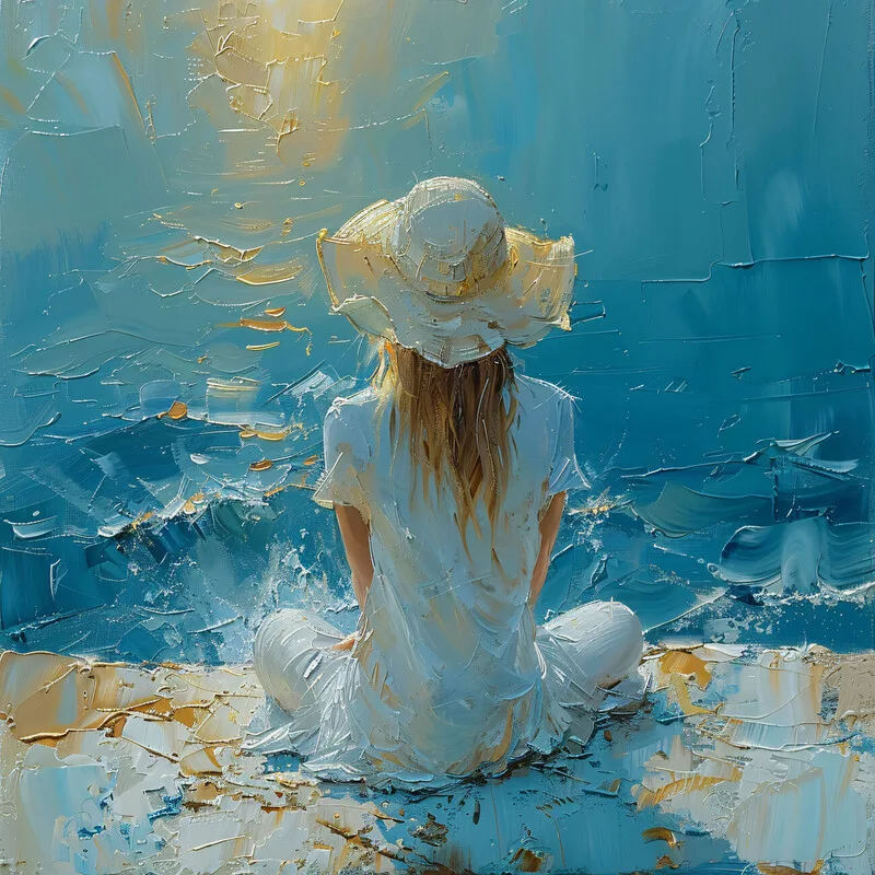 Sticker Beautiful girl in a sea breeze painting, wall art prints