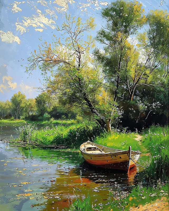 Canvas Print Boat at the Lake's Edge with Crystal-Clear Water – Landscape