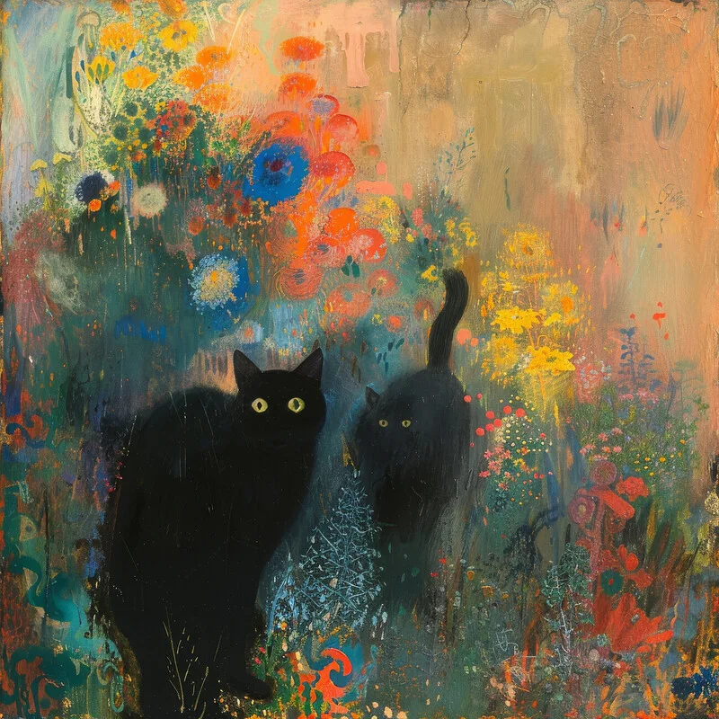 Canvas Print Impressionist Painting, Black Cats in a Colorful Garden