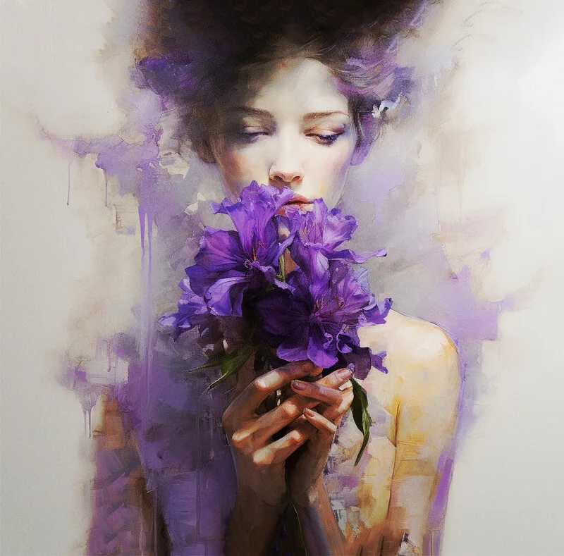 Sticker Purple flowers in hands, beautiful girls, posters prints