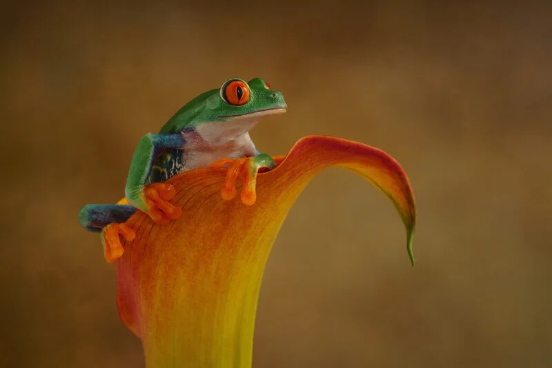 Canvas Print Red eyed tree frog sitting on Arum lily