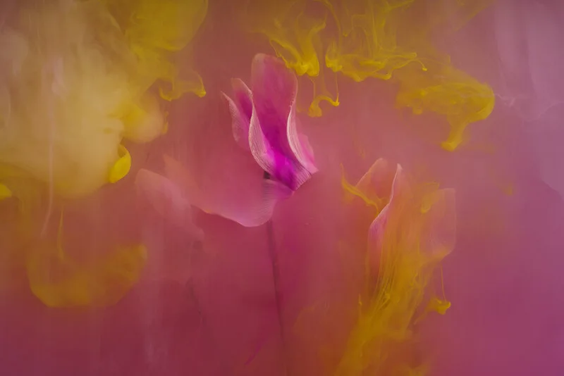 Poster Submerged pink Cyclamen flower with pink and yellow inks