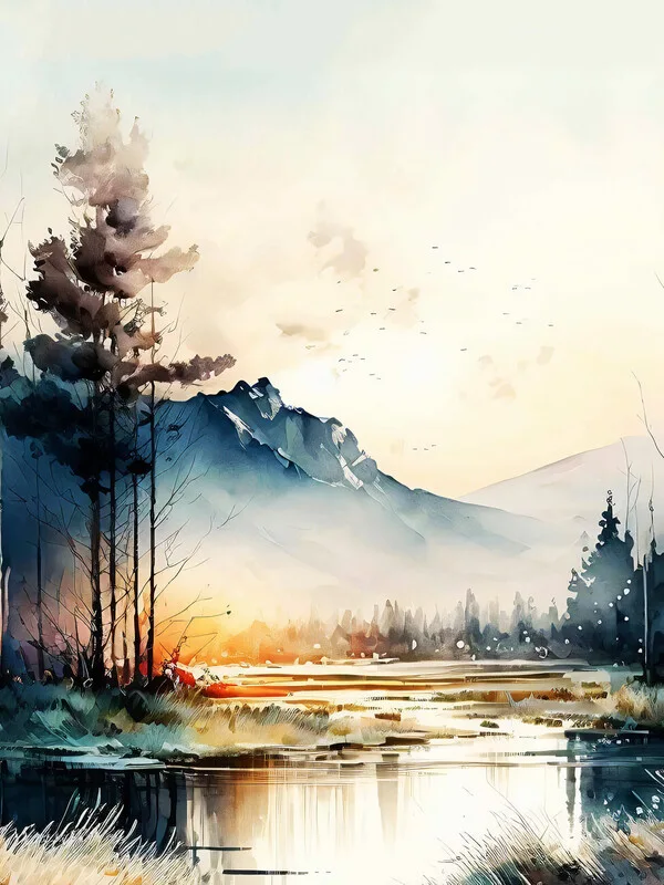 Canvas Print Sunset Lake Landscape Watercolor, poster prints quality