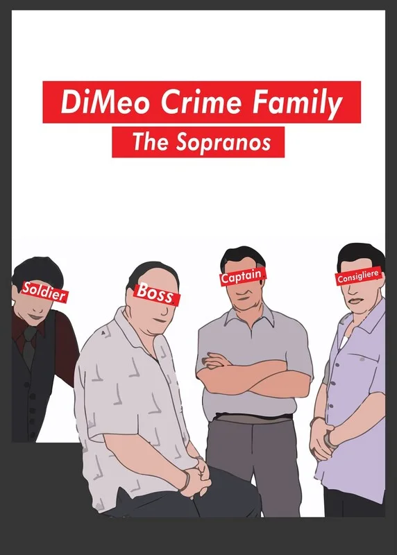 The Sopranos DiMeo Crime Family inspired Poster with Christopher, Tony, Paulie and Silvio posing.