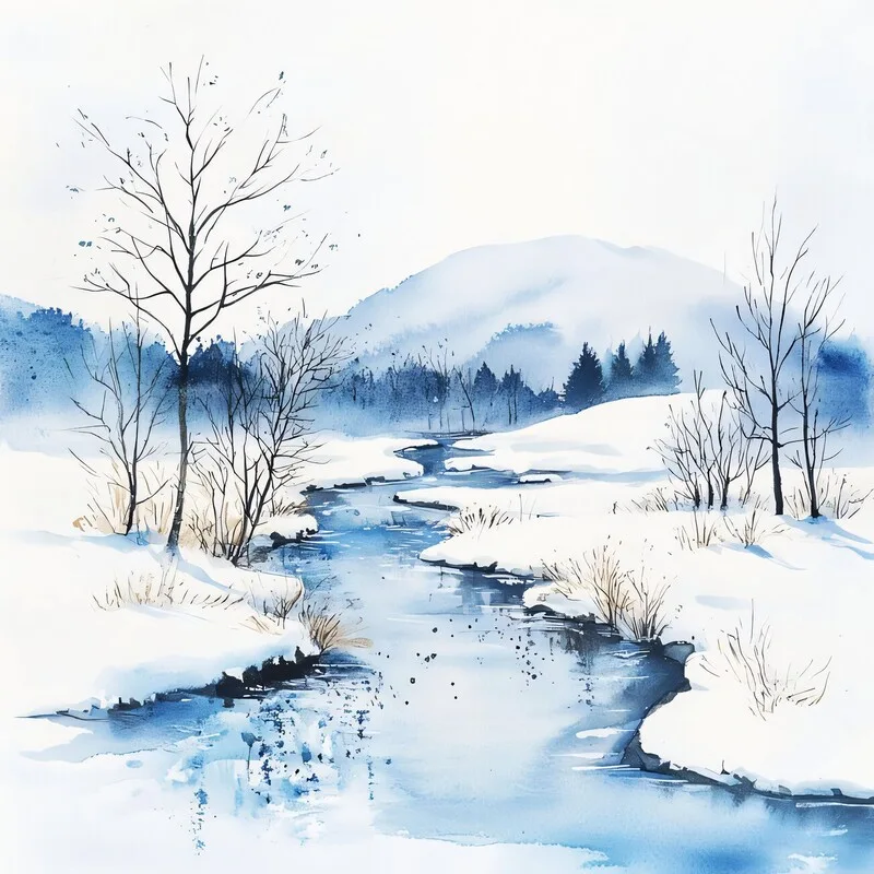 Sticker Winter Stream Watercolor, Snowy River Landscape, wall decor