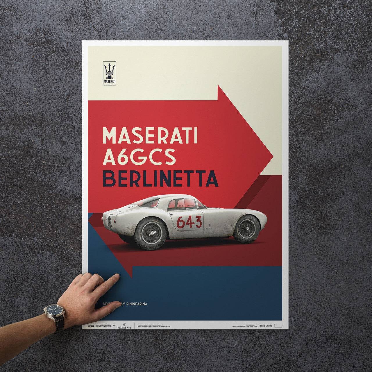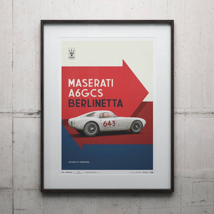 The Maserati A6GCS Berlinetta is an automotive work of art. Ironically, however, it was born out of racing frustration. When torrential rains wreaked havoc on the 1952 edition of the Mille Miglia, making handling of previous A6 models a challenge, racing drivers pushed Maserati for improvements. One solution was to fit a Maserati 2000 Sport with a closed "Berlinetta” body from Pinin Farina. The resulting masterpiece was first presented at the Turin Motor Show of 1954. With only four Pinin Farina models ever created, the A6GCS Berlinetta occupies a special place in automotive history. Automobilist is proud to honour the car's legacy with this Official Licensed Limited-Edition Design Poster.