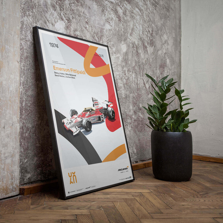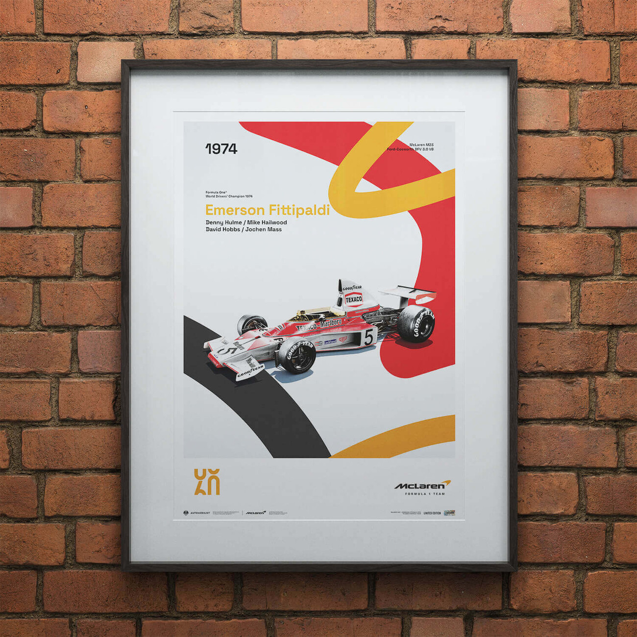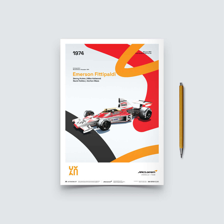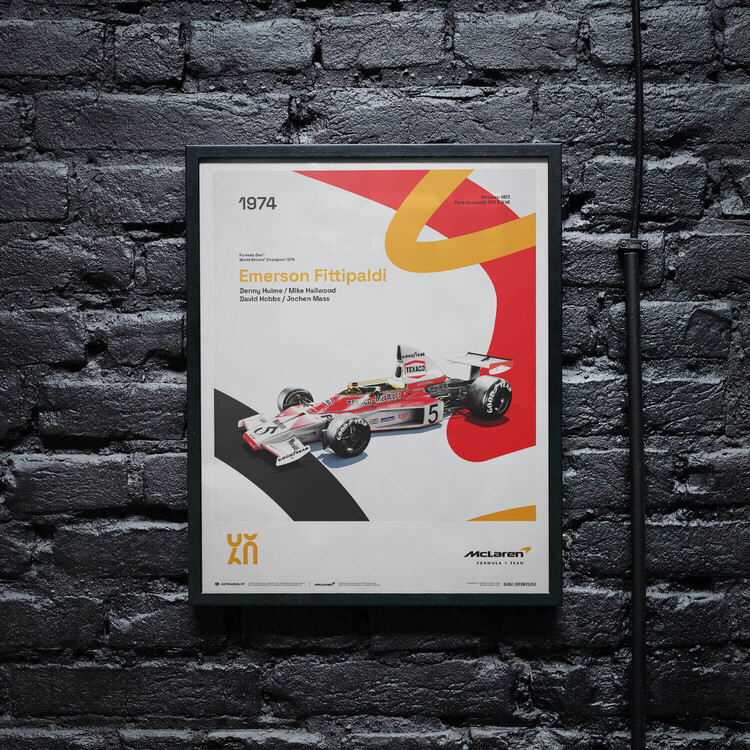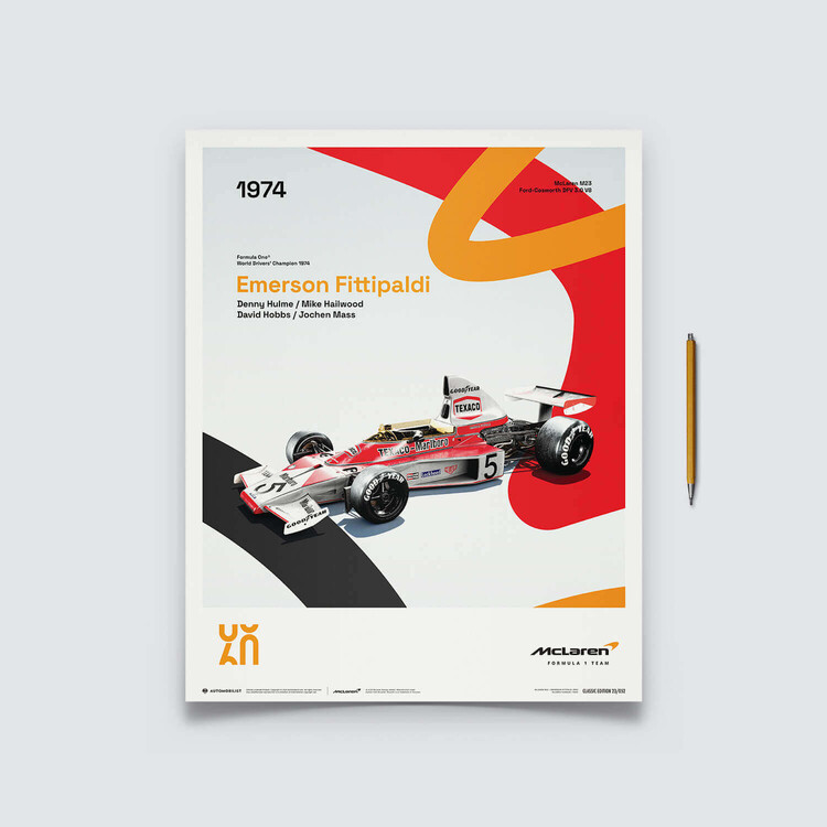Step back in time and relive the glory days of Formula 1 with a poster dedicated to the McLaren M23. Designed in 1973 by Gordon Coppuck and Team McLaren, the M23 combines the best of two worlds - featuring the monocoque of the 1972 Indy 500-winning M16B and the suspension of the M19 F1 car. Its revolutionary Cosworth DFV engine, used as a fully stressed member, propelled this machine to unprecedented heights.