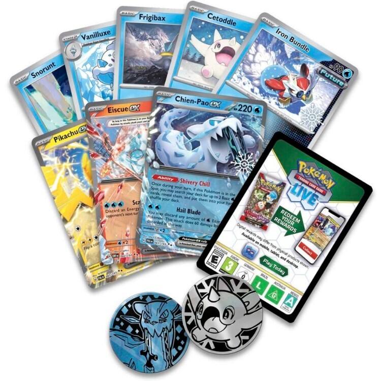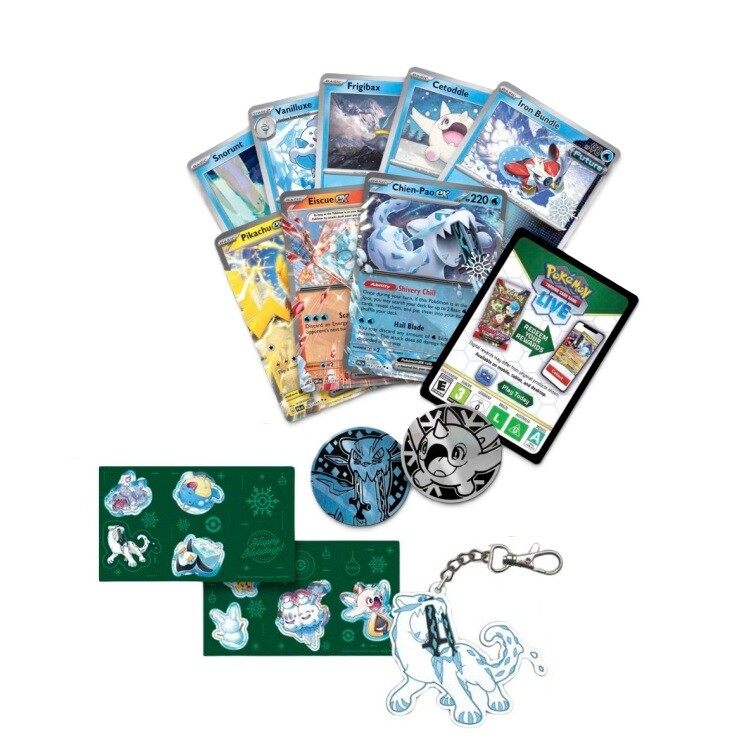 Pokémon TCG Advent Calendar for festive countdown. 25 windows filled with cards and accessories for trainers — from foil promo cards and boosters to a Chien-Pao keychain. Officially licensed product.