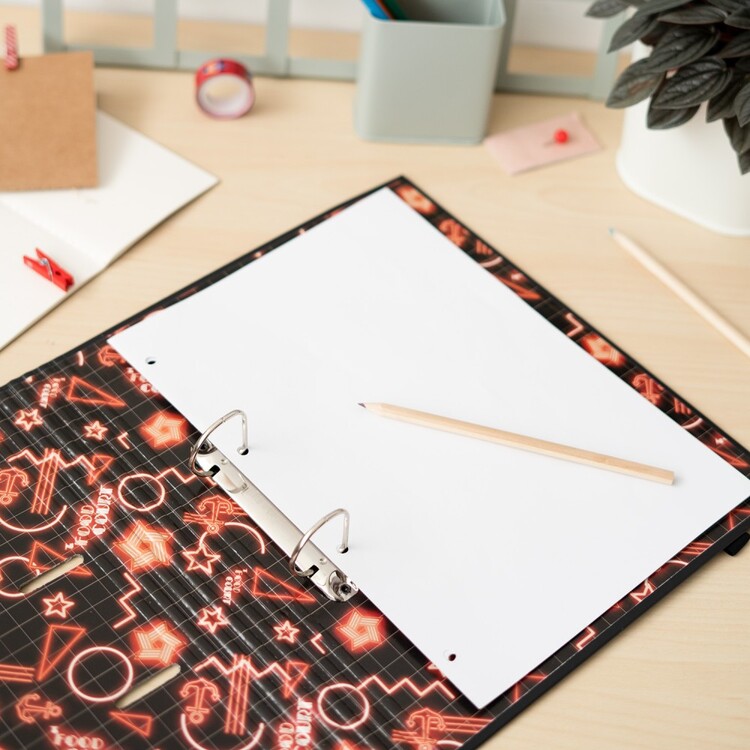 Two-ring binder (35 mm) for easy filing and quick flipping. Rigid boards with a matte laminated finish keep their shape and handle daily use; a compression bar holds pages in place and an elastic closure keeps everything secure. Sheets/refills not included.