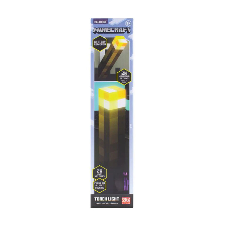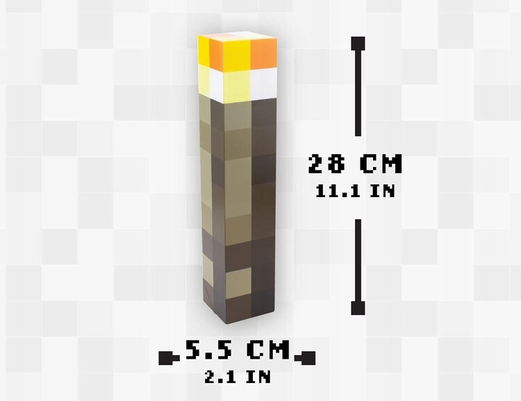 Unique glowing Minecraft torch with two lighting modes. Its dimensions are 28 x 5,5 x 5,5 cm.